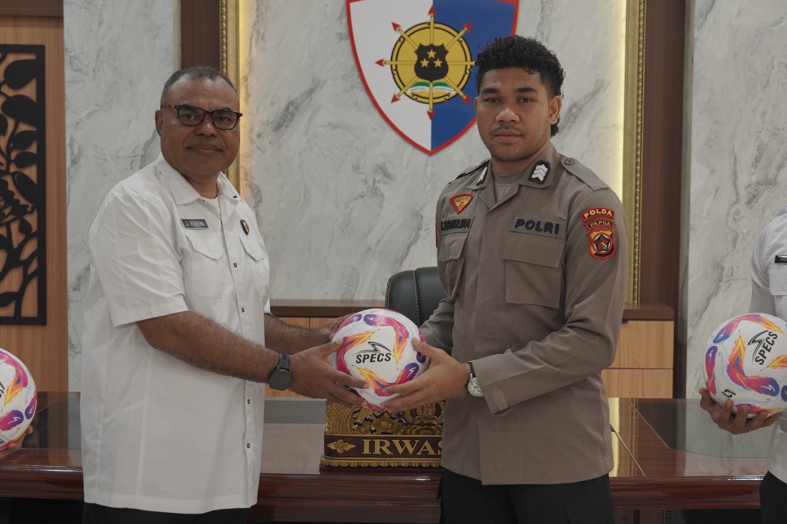Papua – Turnamen Sepak Bola Antar Satuan Kerja (Satker) Polda Papua mendapat dukungan istimewa dari atlet nasional yang juga merupakan personel Polda Papua, Evan Soumilena. Pemain Tim Nasional Futsal Indonesia tersebut memberikan bantuan bola sepak sebagai bentuk kepedulian terhadap pengembangan olahraga di lingkungan kepolisian.