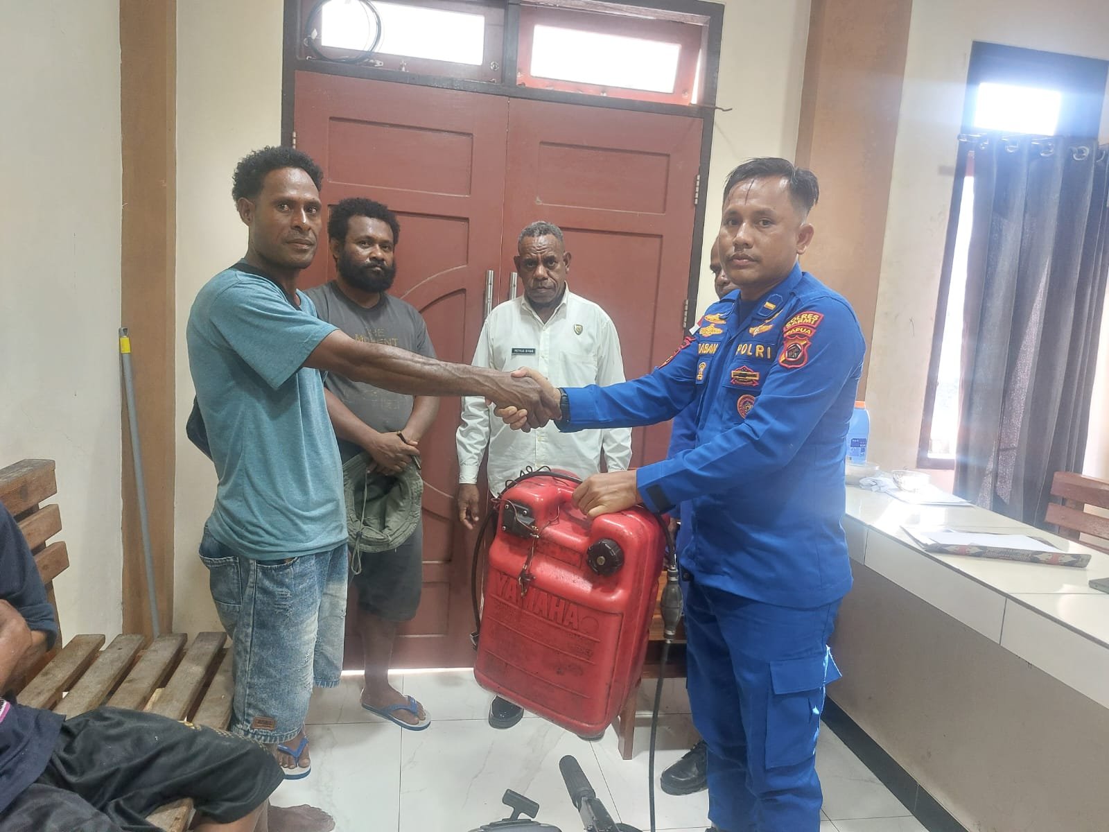 Penyerahan dipimpin oleh KBO Satpolairud Polres Sarmi Ipda Robisten Silaban, S.H., M.H, dan turut disaksikan oleh Ps. Kasiwas Polres Sarmi, personel Satpolairud, perwakilan keluarga nelayan, serta pihak yang menemukan barang tersebut.